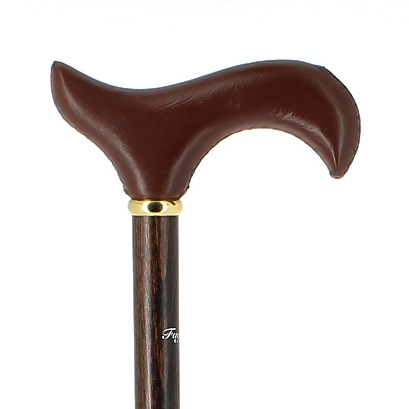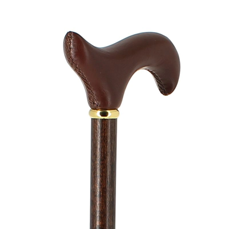 Poignée crochet en cuir marron sur bâton en hêtre teinté foncé