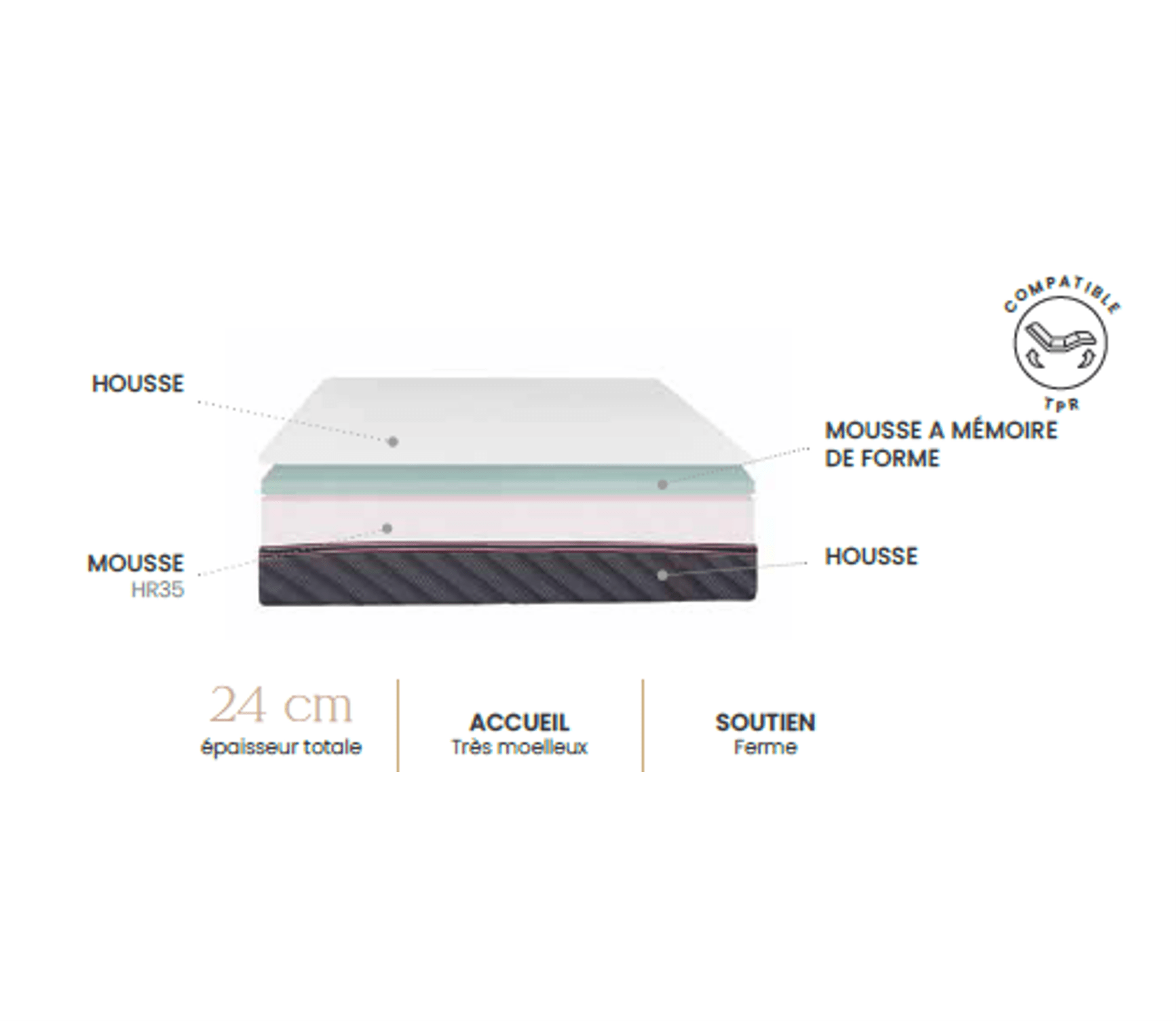 • 18 cm de mousse ALVEO+35 : cette mousse haute résilience assure un soutien ferme et durable, garantissant la longévité du matelas.
